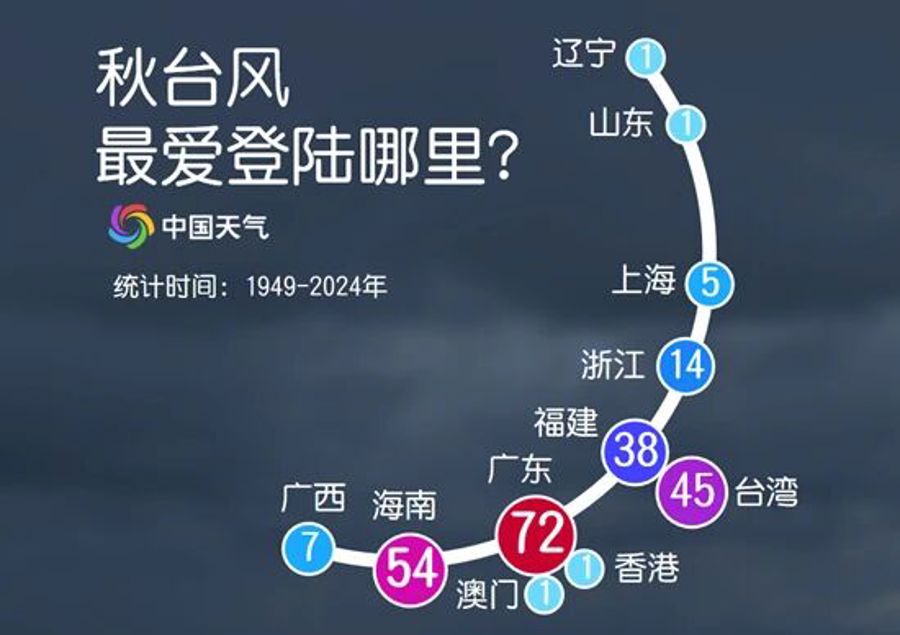 通常,我们把6月至8月生成的台风称为夏台风,9月至11月生成的台风称为秋台风。中国天气网统计显示,1949年至2024年间,夏季生成台风个数为867个,为台风最活跃季节,而秋季也有859个台风生成,全年占比44%,仅次于夏季。也就是说,一年中有四成以上台风为秋台风。