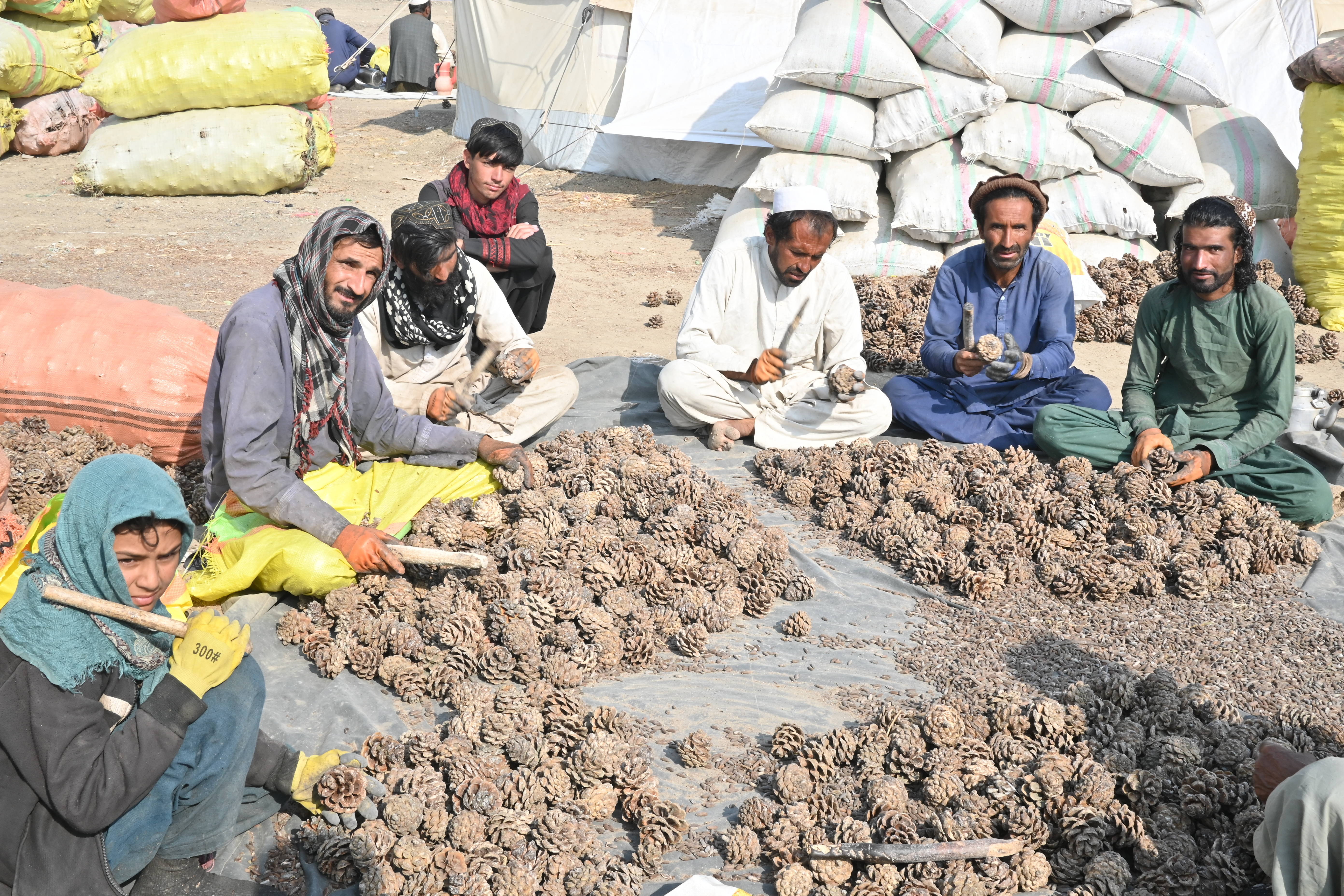 这是10月28日在阿富汗霍斯特省拍摄的松子加工交易市场。用木棍将松子从松塔中敲出来是当地人采集松子的方式。新华社记者张艺缤摄单纯的农产品作物出口,简单粗放的采收处理模式,导致阿富汗松子难以进一步增值,至今没打造出响亮的自有品牌,也更易受到国际市场价格波动的影响。