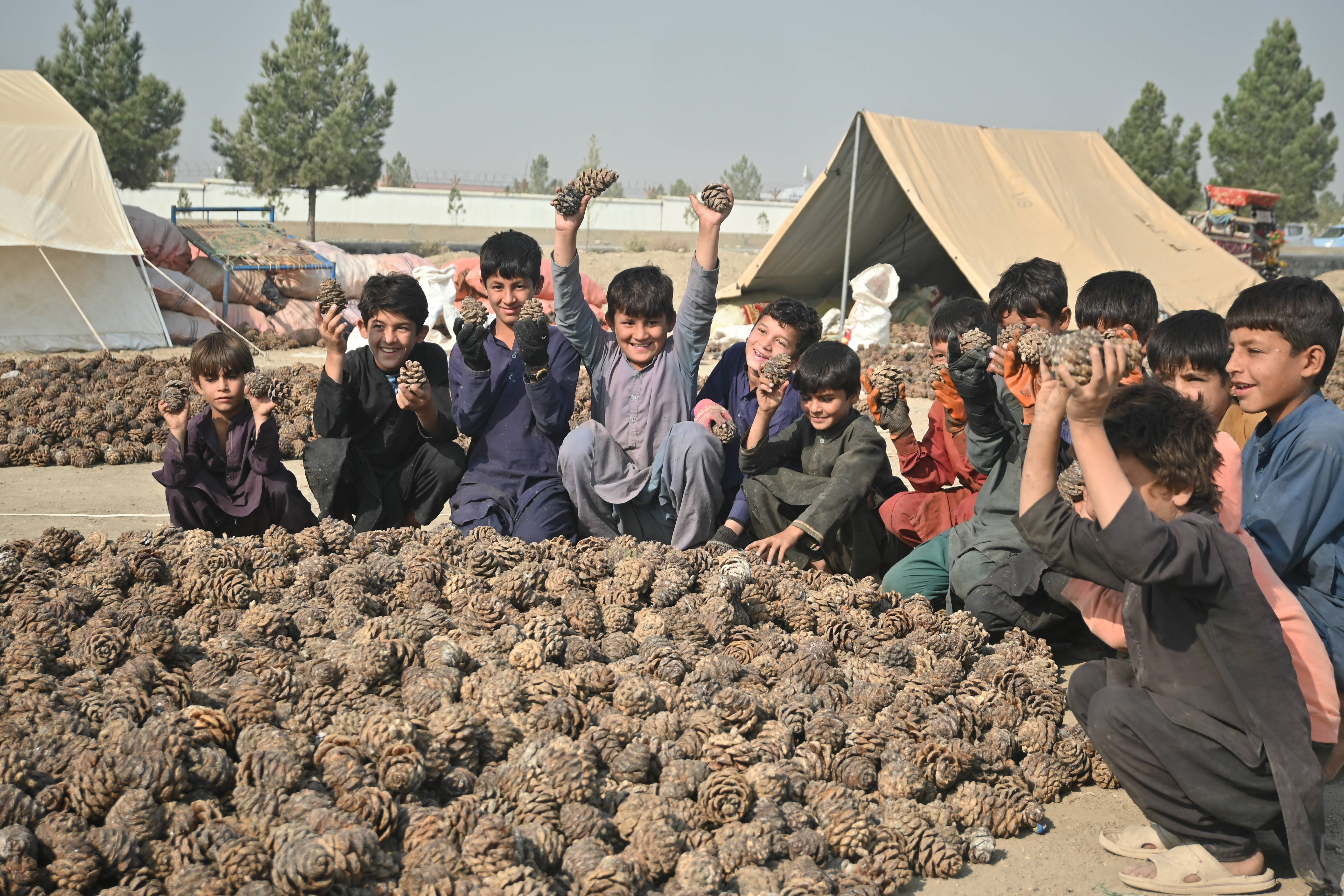 10月28日,在阿富汗霍斯特省的松子加工交易市场,当地儿童帮忙采集松子。新华社记者张艺缤摄来自帕克蒂亚省的劳工贾赫德,养活妻子和6个孩子的重担要靠他的双肩扛起,每年松子采收季他都会来到霍斯特打工。他努力用木棍将松子从一个个松塔中敲出来。从清晨到黄昏,贾赫德每天工作10多个小时,收入仅有200至300阿富汗尼(约合20至30元人民币)。“今年产量确实大,但价格比往年低多了。”他说,“不过有活干,总比闲着好。”